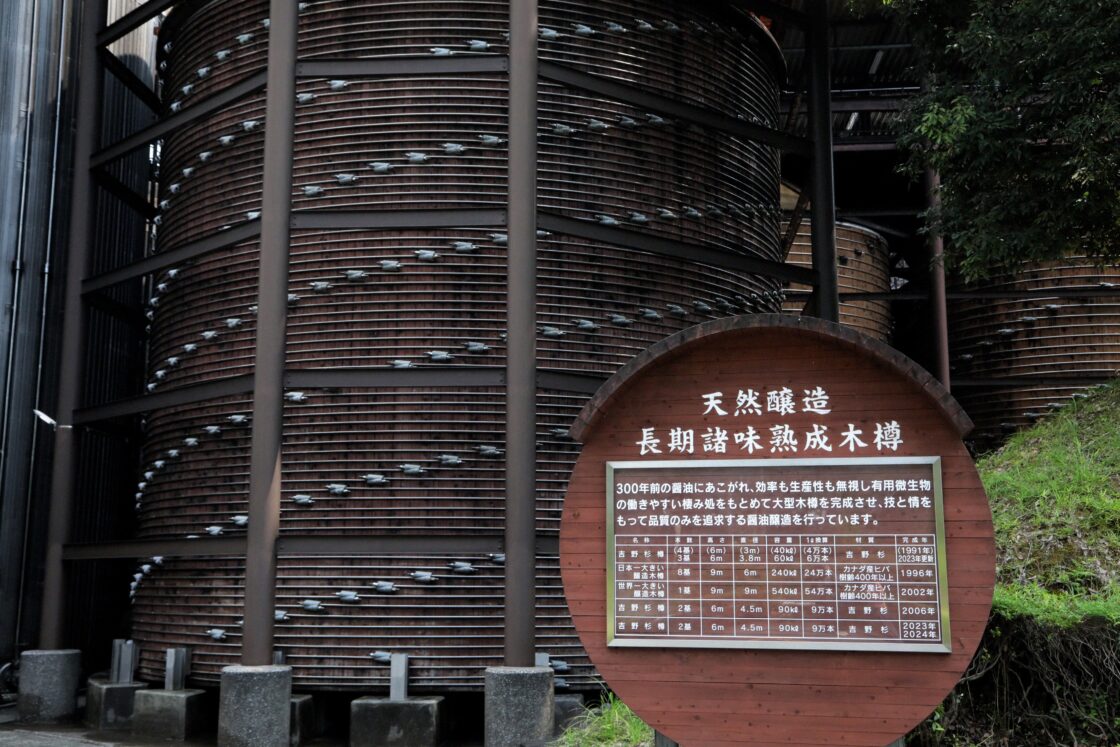 カナダ産ヒバや吉野杉を使った木樽は全部で16基あり、木樽ごとに香りや味わいが異なります。そのうちのひとつは高さ・直径ともに9メートルの大きさで、540klもの量の製造が可能。『世界一の木造醤油樽』として、2007年にギネス世界記録に認定されました。