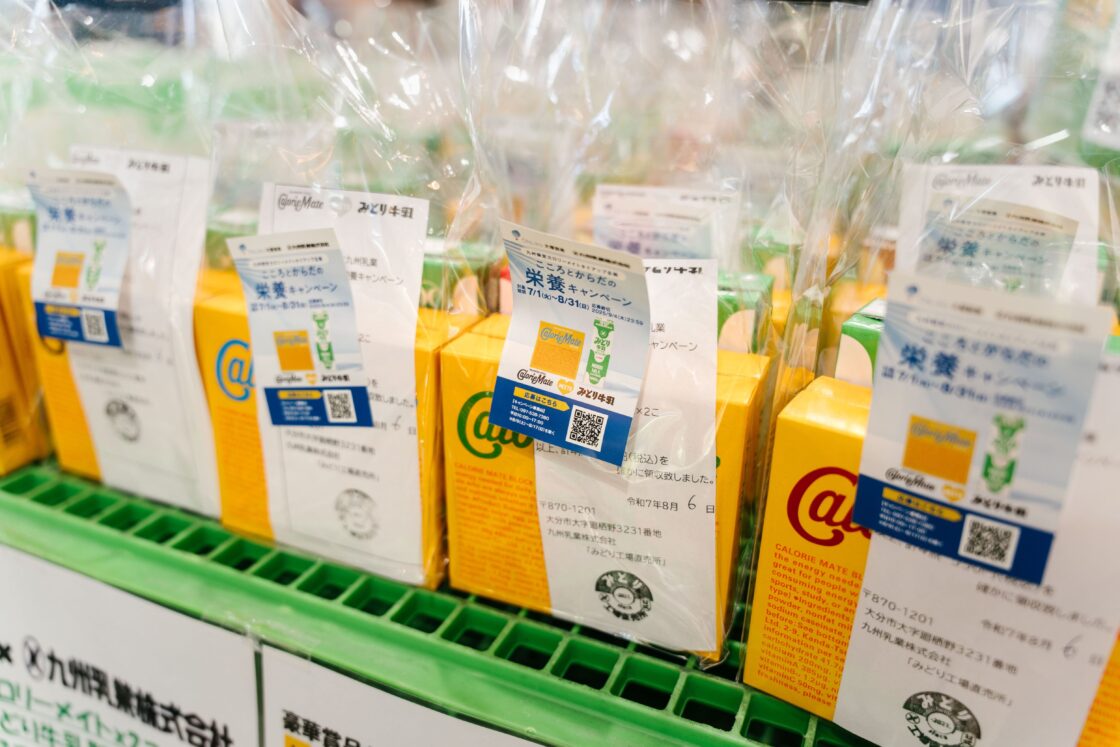 取材時(8月)に実施していたのは、牛乳によく合う大塚製薬の「カロリーメイト」×九州乳業の「みどり牛乳」の「こころとからだの栄養キャンペーン」。