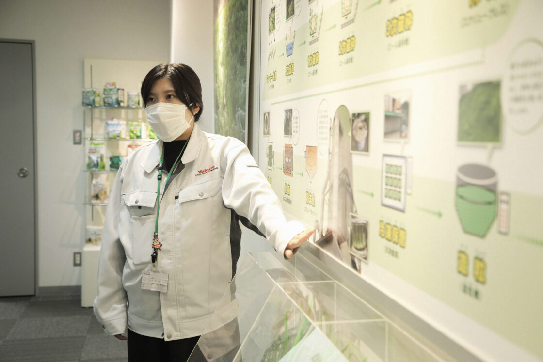工場を案内してくださった生産部の川島さん。青汁やその製造工程について分かりやすく丁寧に説明してくださいました。なお、工場見学も受け付けており、1人〜OK(要事前予約)。地元の小学生や中学生、老人会、愛飲者など幅広い方が訪れています。