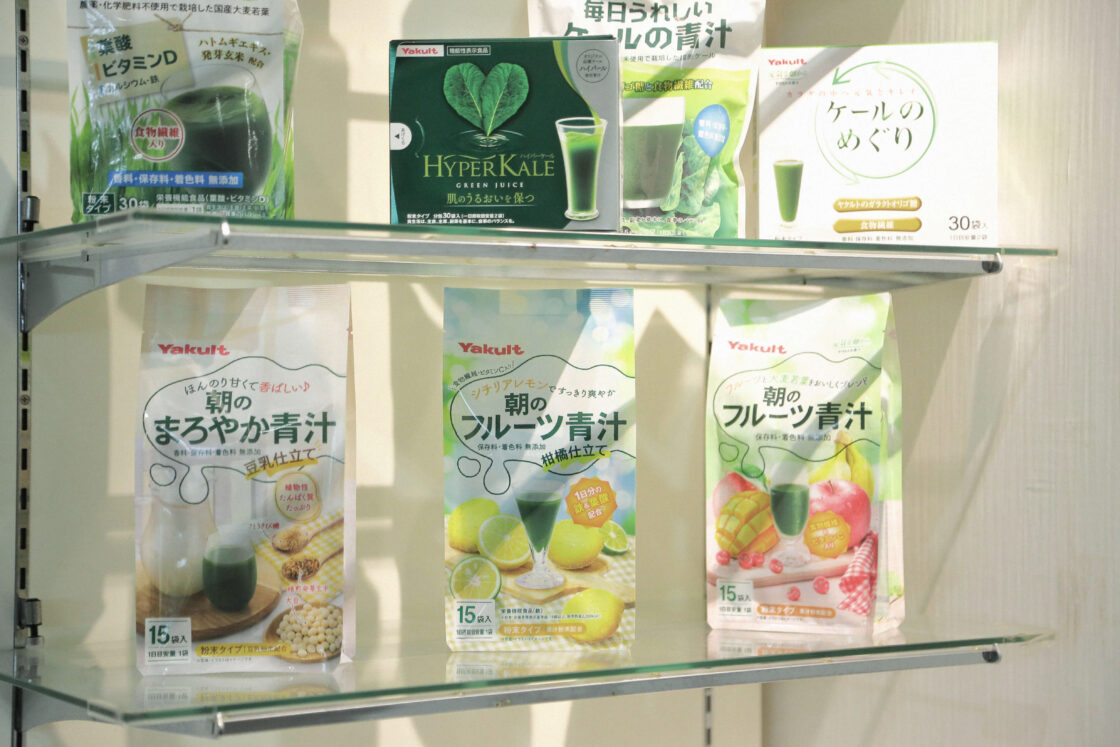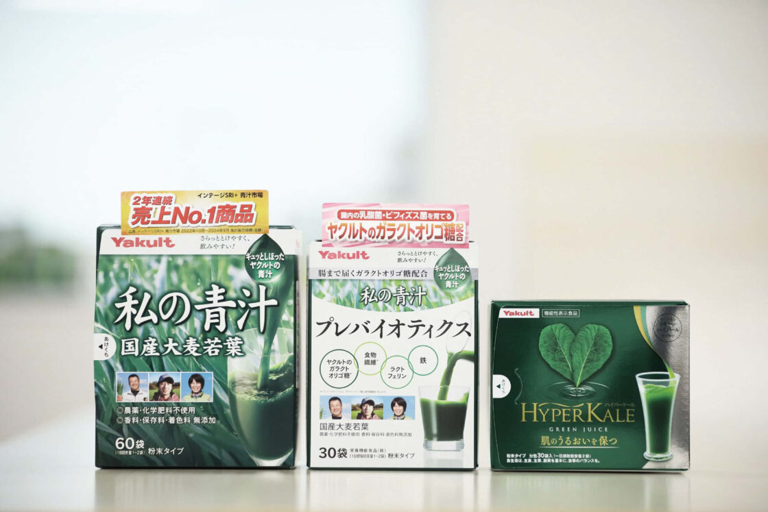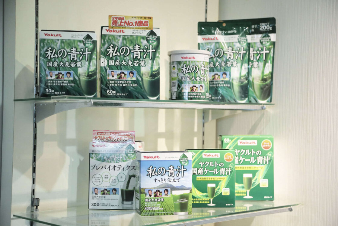 種類豊富なヤクルトヘルスフーズの青汁。サプリメントに関しては商品設計を自社で行い、製造は外部パートナーと連携して行っています。