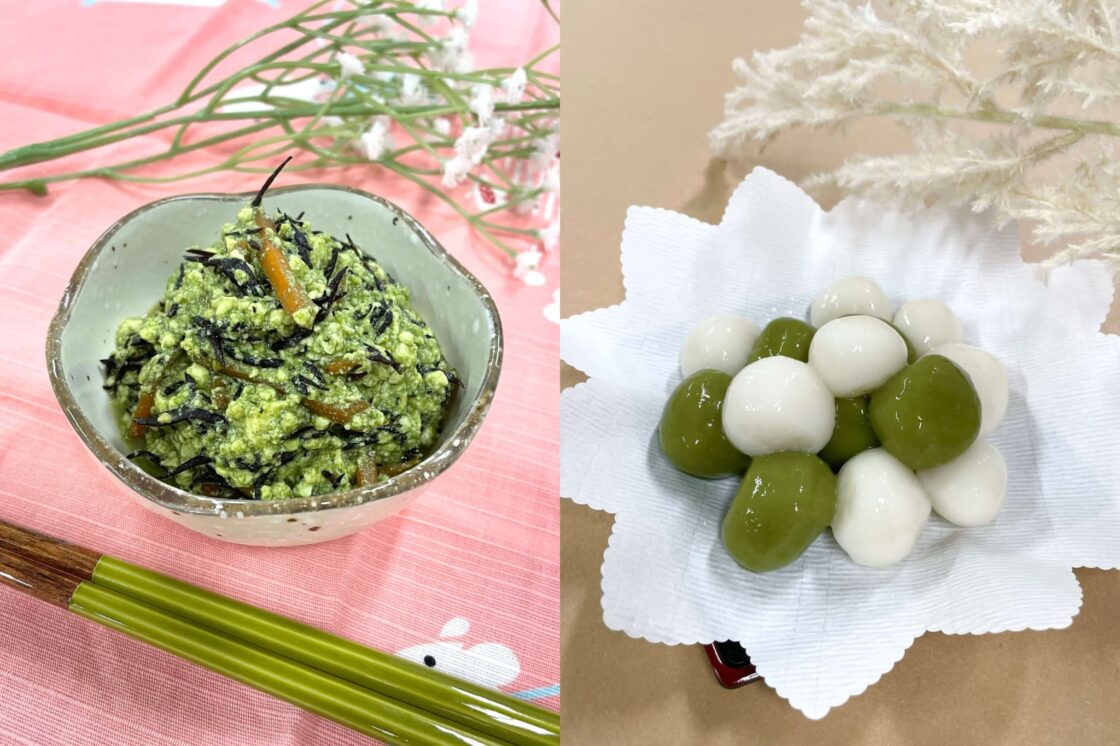 青汁を使ったレシピ(左)ひじきの緑和え、(右)月見だんご。緑が鮮やかなので、写真映えもバッチリ。