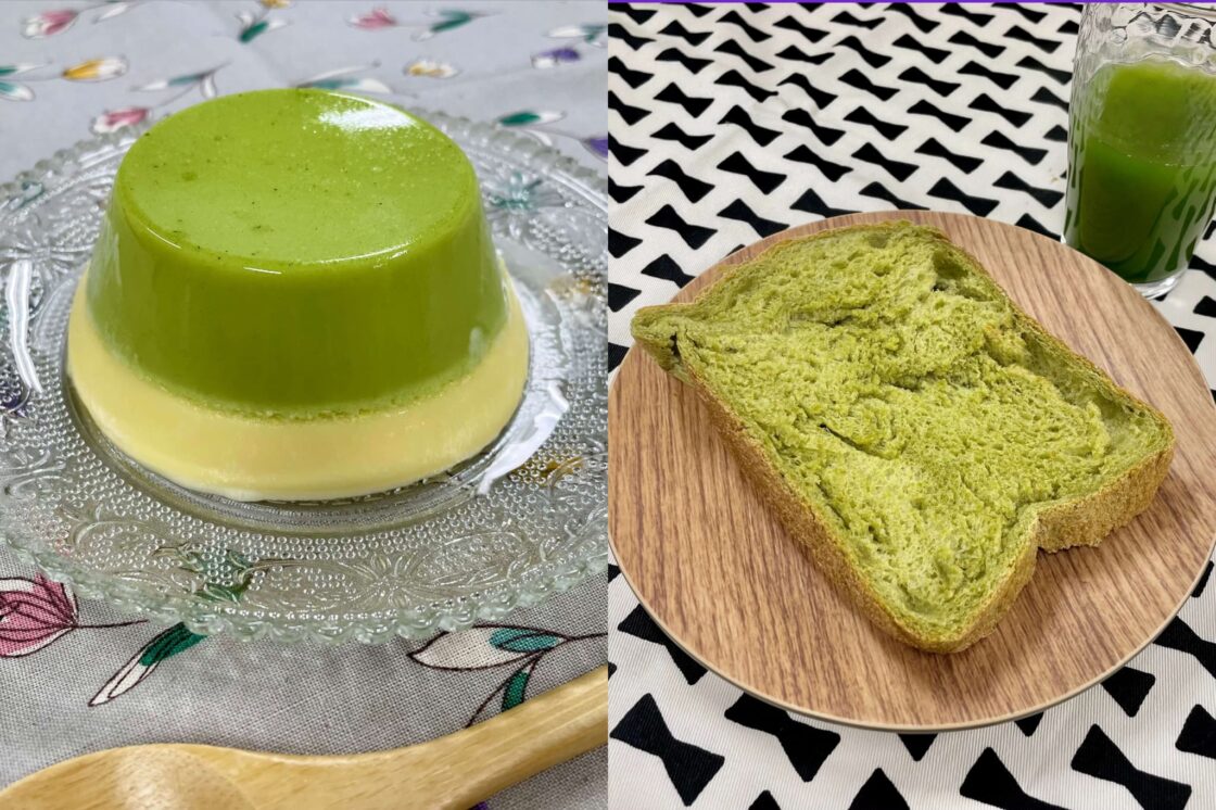 青汁を使ったレシピ(左)青汁ババロア、(右)青汁食パン。ヤクルトヘルスフーズの青汁はクセがないのでどんな食材とも相性抜群です。