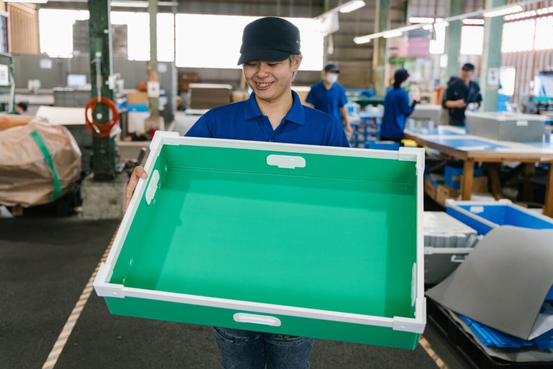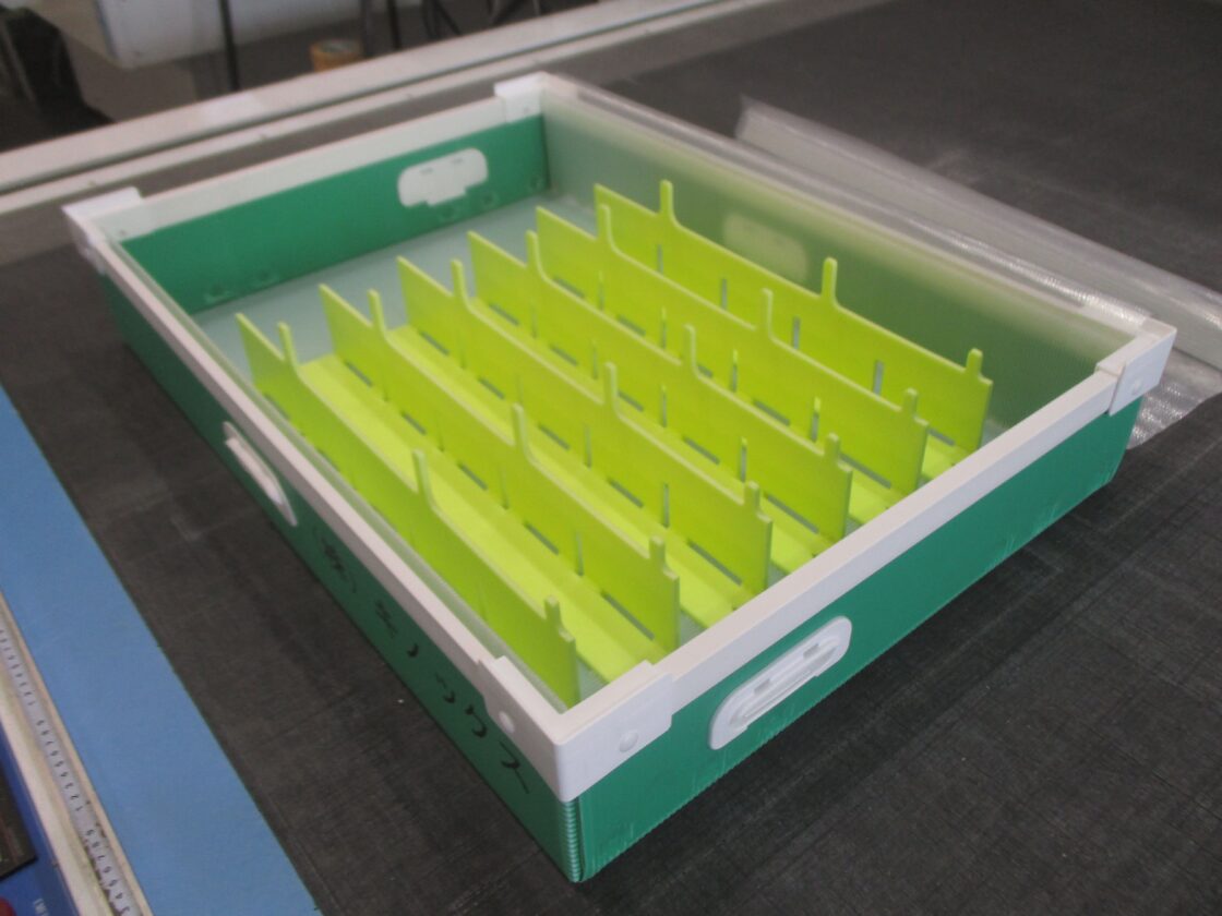 軽くて丈夫なプラスチックダンボール製の通い箱。自動車部品の工場間輸送などで、繰り返し使用されます。